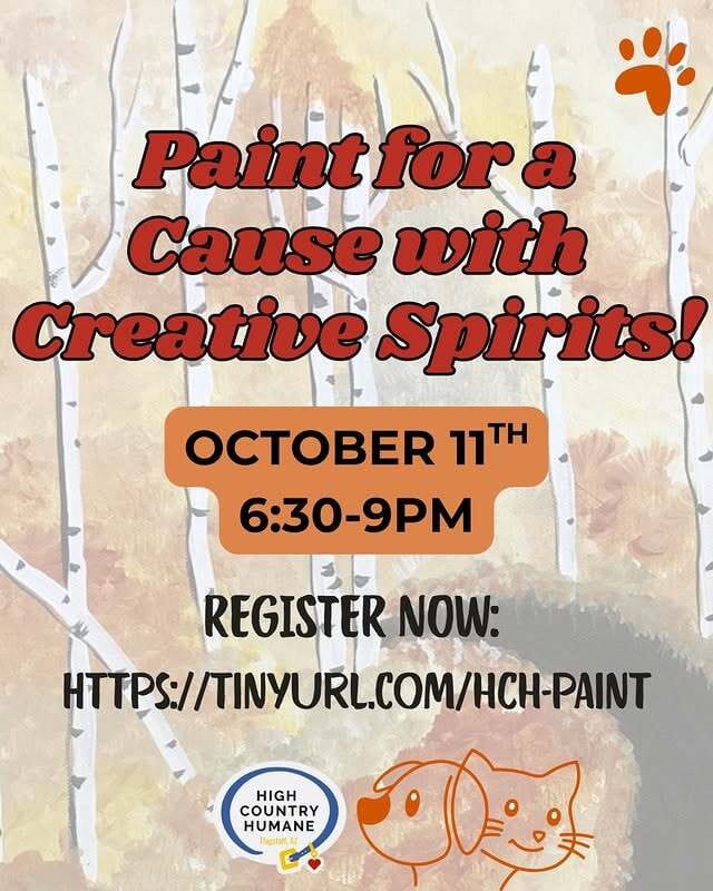 Support shelter pets while creating your own masterpiece! Creative Spirits will guide you step-by-step in this fun, BYOB painting class. A portion of proceeds goes to High Country Humane. 👩🎨 October 11th, 6:30-9pm, Creative Spirits